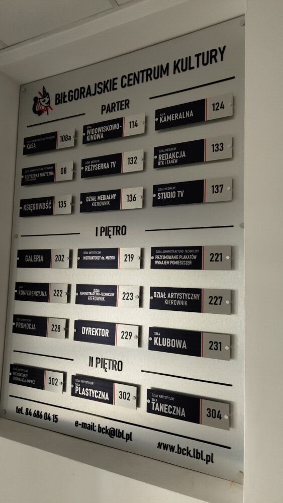 Tablica informacyjna zbiorcza, wykonana z dbałością o styl, czytelność oraz estetykę, doskonale sprawdzi się w różnorodnych miejscach, takich jak urzędy, hotele, szkoły, biurowce i wiele innych, gdzie istotne jest klarowne przedstawienie funkcji oraz lokalizacji pomieszczeń. Dodatkowo, umieszczenie na tablicy logo wyróżni firmę, podkreślając jej profesjonalizm oraz spójną identyfikację wizualną.