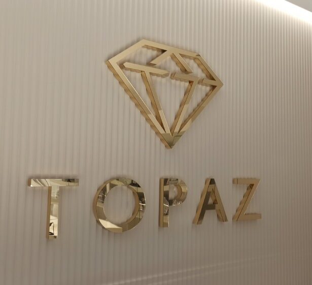 napis wykoanany ze złotej taśmy aluminiowej i złotej lustrznej pleksy