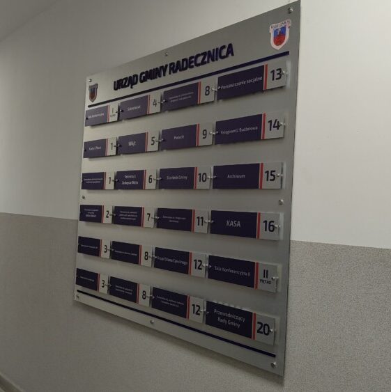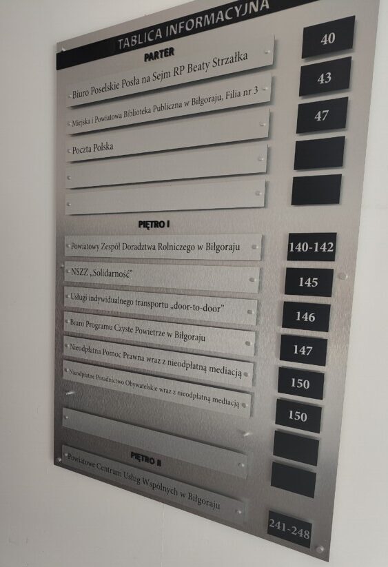 tablica warstwowa wykonana ze szczotkowanego dibondu z nadrukiem uv, wymienne tabliczki,montowana na dystansach